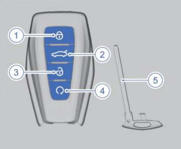 Если электронный ключ находится в пределах диапазона обнаружения, сначала нажмите кнопку запирания дверей на электронном ключе, а затем в течение 2 секунд нажмите и удерживайте кнопку дистанционного запуска двигателя, чтобы запустить двигатель. • Когда двигатель запущен дистанционно, а электронный ключ находится в пределах зоны обнаружения, дважды нажмите кнопку дистанционного запуска двигателя, чтобы заглушить двигатель.